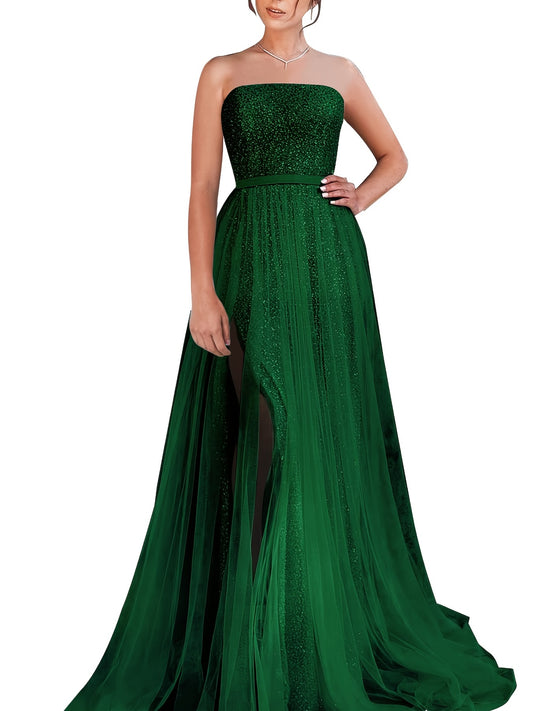 Strapless Sequins Prom Dress, Long Tulle Ball Gown Split Sparkly Formal Evening Party Gown For Women, Women's Clothing