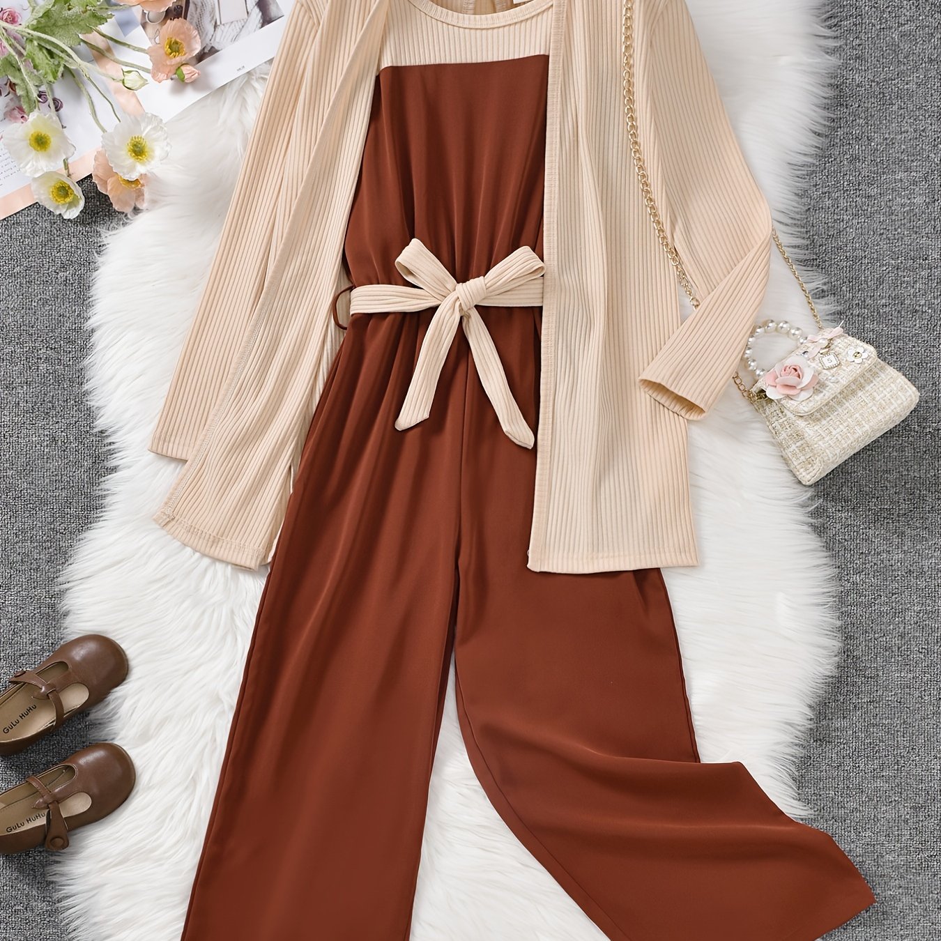 3PCS Girls Cotton Coat & Brown Jumpsuit with Bow Belt Set